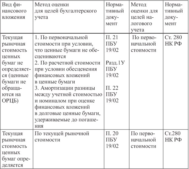 В табл.4 приведены методы последующей оценки финансовых вложений в ценные бумаги, применяемые для целей бухгалтерского и налогового учета.