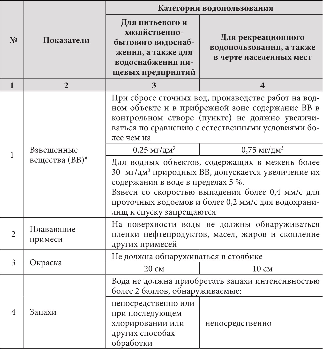 Качество воды водных объектов должно соответствовать требованиям СанПиН 2.1.5.980-00 (табл. 1), при этом содержание химических веществ не должно превышать ПДК веществ в воде водных объектов по ГН 2.1.5.689-98 «Предельно допустимые концентрации (ПДК) химических веществ в воде водных объектов хозяйственно-питьевого и культурно-бытового водопользования».