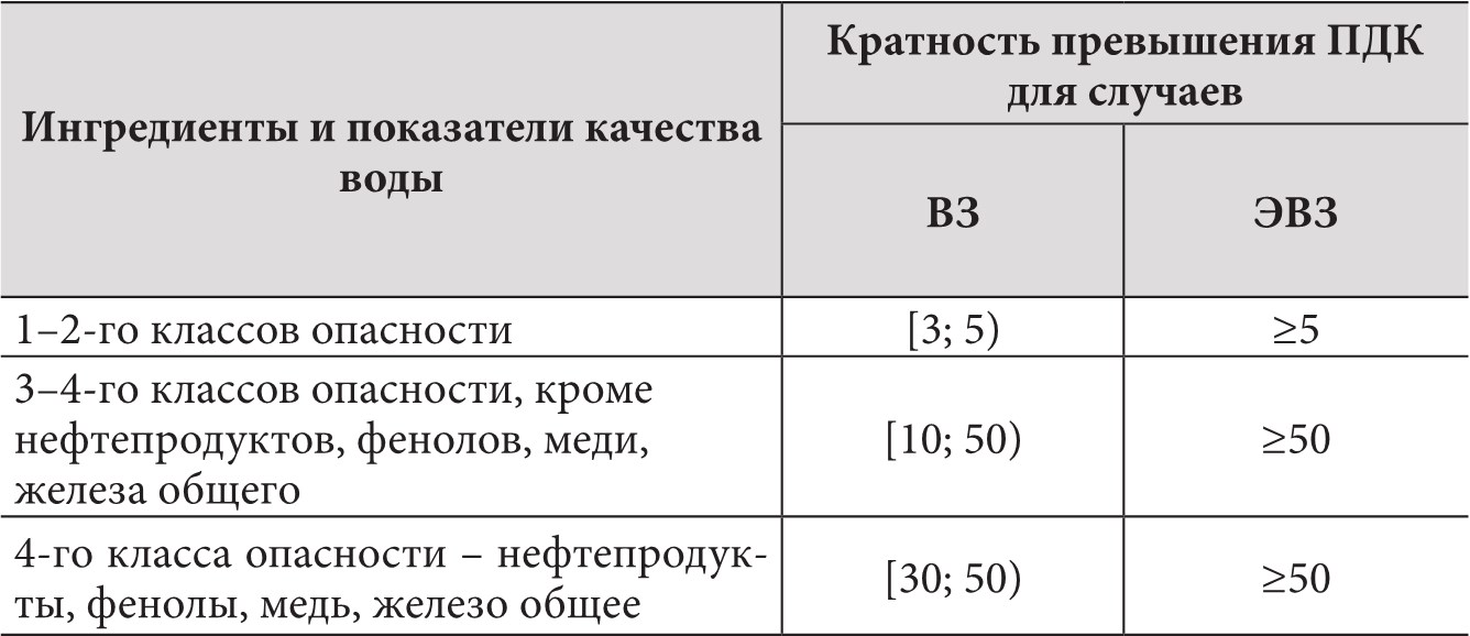 Обобщенные критерии определения случаев ВЗ и ЭВЗ для поверхностных вод суши с учетом класса опасности веществ приведены в таблице 2. Критерии оценки уровня загрязненности воды с учетом кратности превышения ПДК и повторяемости случаев превышения представлены в таблице 3.