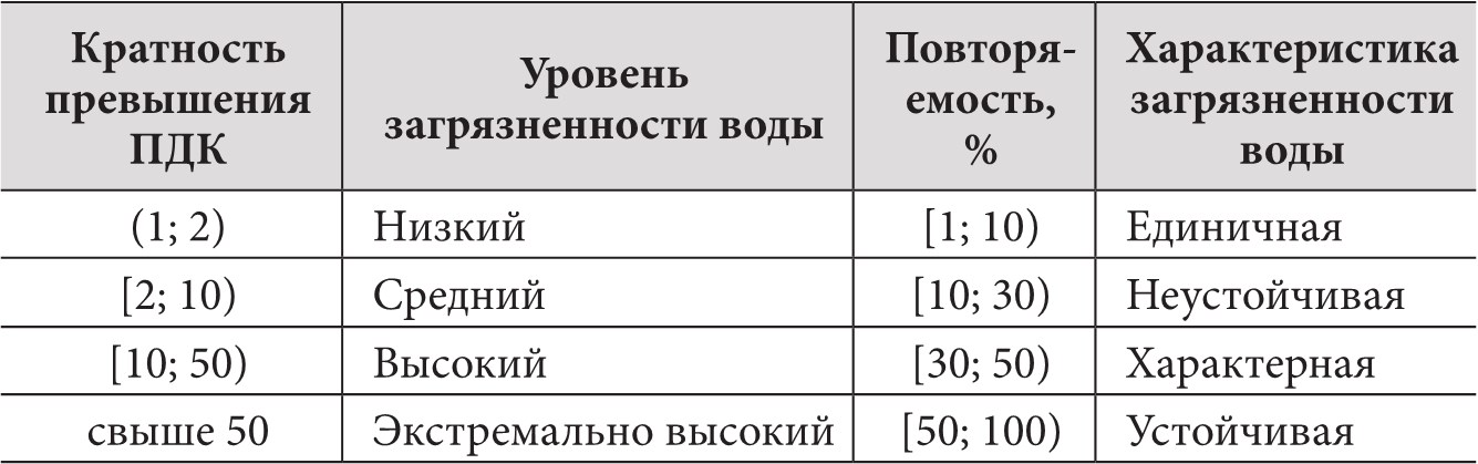 Критерии оценки уровня загрязненности воды по кратности превышения ПДК и повторяемости случаев превышения (РД 52.24.643-2002)