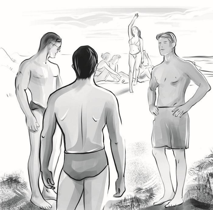 К огромному удивлению ребят, они не были первыми на пляже. Несколько девушек, к глубокому сожалению Трубача и Шницеля, все еще одетых в купальники, расстилали свои полотенца на песке.