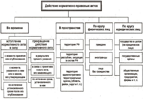 Установление пределов действия нормативно-правового акта предполагает установление его действия во времени, в пространстве и по кругу лиц (рис. 1).