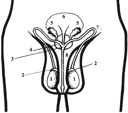 1 – яичко; 2 — придаток яичка; 3 – мочеиспускательный канал; 4 — предстательная железа; 5 — семенные пузырьки; 6 — мочевой пузырь; 7 – семявыносящий проток; 8 – тело члена