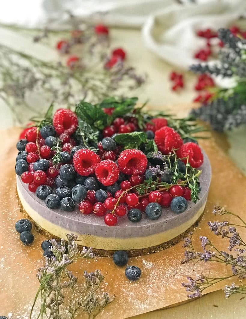 4 Пока наш апельсиновый слой застывает, готовим черничный крем. Взбиваем орехи кешью, чернику, кокосовое масло и виноградный сахар в блендере до состояния нежного крема, выливаем полученную смесь на апельсиновый слой. Убираем в морозилку до полного застывания на 5–6 часов или на ночь.