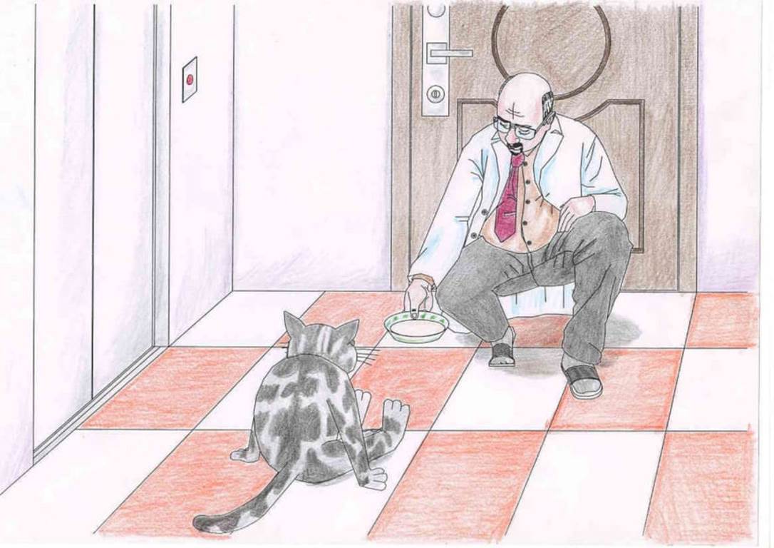 Васька сидел в клетке, но скучать ему не приходилось. Пётр Семёнович постоянно бегал вокруг клетки, то светил ему в глаза фонариком, то снимал на камеру, постоянно что-то бубнил, даже пытался измерить ему температуру с помощью градусника, но Васька не дался. Единственное время, когда ему удавалось отдохнуть – это поздно ночью или когда Пётр Семёнович уходил из квартиры. Через день Пётр Семёнович пододвинул к клетке телевизор, чтобы кот мог смотреть образовательные каналы. Васька сначала смотрел лишь время от времени, когда показывали еду, других животных или быстро двигающиеся подозрительные предметы, а затем понемногу стал втягиваться. К своему удивлению Васька начал понимать происходящее на экране, стал разбирать человеческую речь: отдельные слова, фразы. Дальше – больше. Свои знания он тщательно скрывал, так как не знал, как к этому отнесется Пётр Семёнович. А ну как укол сделает! Васька чувствовал, что от этого старичка можно ждать только неприятностей. Во время просмотра мультфильма Васька увидел, как попугай сам крылом открыл себе клетку, залез хозяину в холодильник, наелся всяких вкусностей, а затем вернулся назад в клетку. Вернувшийся хозяин побил пса за обнаруженный в холодильнике погром. Идея показалась Ваське крайне занимательной. Он попробовал лапкой. Крючок на клетке поддался, дверца распахнулась. Васька выбрался, погулял по квартире, подошел к холодильнику, но тут загремели ключи в замке входной двери. Он кинулся назад, забрался в клетку, захлопнул дверцу, только крючок закрыть не смог. Вот незадача! Этот момент он продумать не успел. Оставалось лишь ожидать дальнейшего развития событий, ибо сделать что-либо не представлялось возможным. Пётр Семёнович, отдуваясь вошел, кряхтя переобулся и с пакетами проследовал на кухню мимо открытой двери рабочего кабинета, который был также и его лабораторией. Васька опять в отчаянии попытался запереть клетку. Получилось лишь чудом в последний момент. Васька облегченно выдохнул. Следом в комнату вошел Пётр Семёнович с пластиковым подносом, на котором что-то стояло закрытое салфеткой. Он внимательно осмотрел Ваську, достал диктофон и стал надиктовывать свои наблюдения: