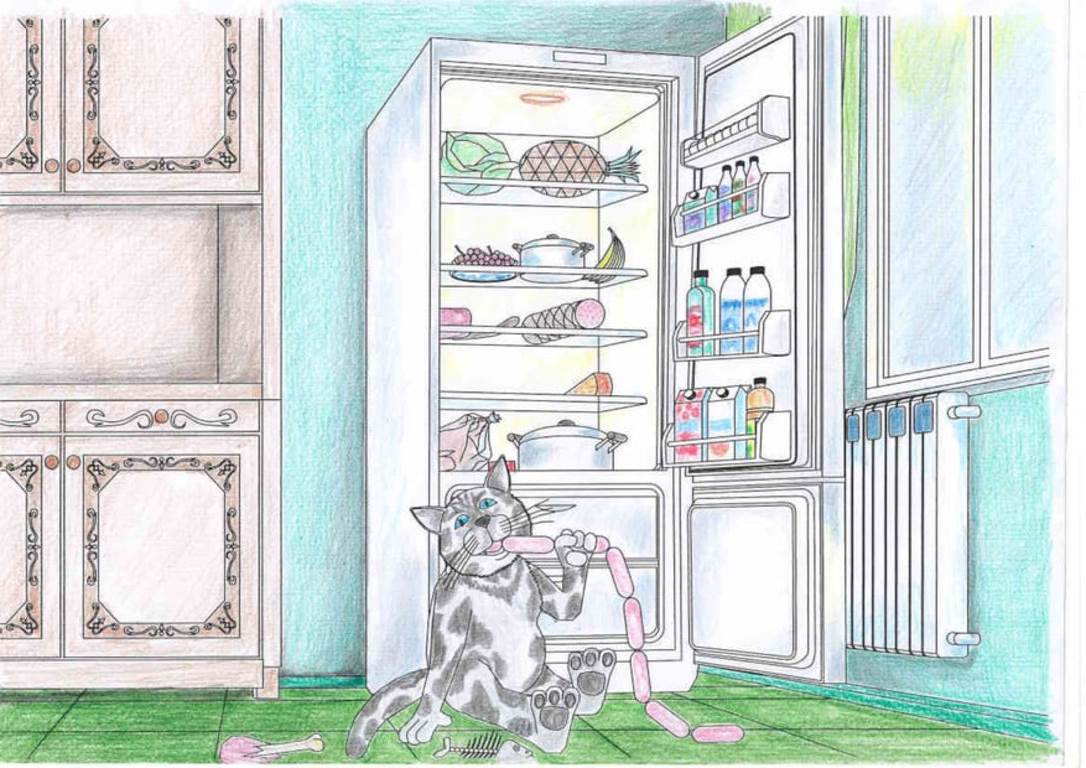 Этот день Васька провел замечательно. Как только дверь за Петром Семёновичем закрылась, Васька выбрался из клетки и важно прошествовал к холодильнику. Открыть агрегат оказалось очень непросто. Удалось это не с первого и не со второго раза. Васька ухватился когтями передних лап за край дверцы, а задними лапами уперся в корпус холодильника, напрягся изо всех сил раз, другой. И вдруг дверца резко открылась. От неожиданности он сорвался, упал, но тут же вскочил, завороженно наблюдая, как открывается освещённый портал в мир вкусных запахов и прохлады. Его взору открылись полки, заставленные съестным: кастрюля с супом, кусок сыра, бутылки с молоком, открытые рыбные консервы, селедка в целлофановом пакете, моток сосисок, соединенных оболочкой одна к другой, кусок вареной колбасы, ветчина во вскрытой упаковке, творог в пакете. Пока он раздумывал, холодильник начал противно пищать. Это сильно нервировало. Первым делом Васька попробовал консервы. Есть из банки было очень неудобно. В конце концов он опрокинул её прямо на кастрюлю с супом. Крышка на кастрюле приподнялась, банка проскользнула внутрь и, булькнув, погрузилась в суп. Васька и бровью не повел. Он уже попробовал ветчину. Потом потянул сосиски и упал вместе с ними с полки на пол.