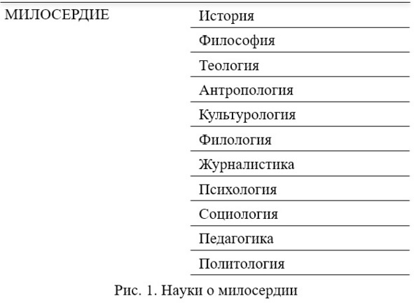 К наукам, которые изучают милосердие, можно отнести историю, философию, теологию, антропологию, культурологию, филологию, журналистику, психологию, социологию, педагогику, политологию.