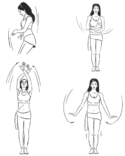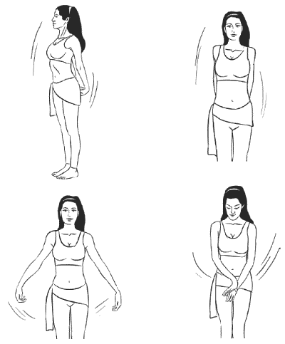 Танец живота1. Станьте прямо, заведите руки за спину, соедините ладони. Отведите руки назад, насколько это возможно. Подайте грудь вперед, растягивая верхнюю часть тела. Задержитесь в этой позе на 20–30 счетов.