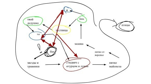 – А судя по твоей схеме, основных точек у нас всего четыре: птицы, я, ты и бог.