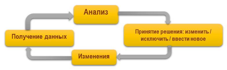 Получать информацию о состоянии бизнеса, анализировать ее, принимать решение об изменениях в компании или в стратегии, вносить изменения в компании, снова собирать информацию и анализировать. Такова спираль развития.