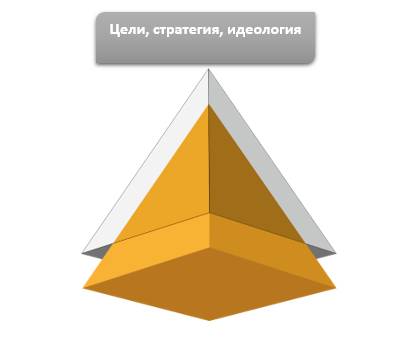 Вершиной прозрачной пирамиды являются цели, стратегия и идеология. То, что является своеобразным движком для вашего бизнеса. Плюс короткая, но емкая миссия, которая вместила в себя ответы на вопросы – куда вы идете, для чего и каким путем.