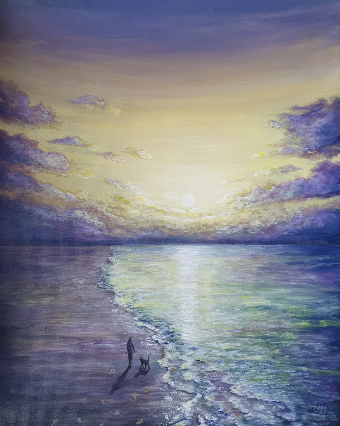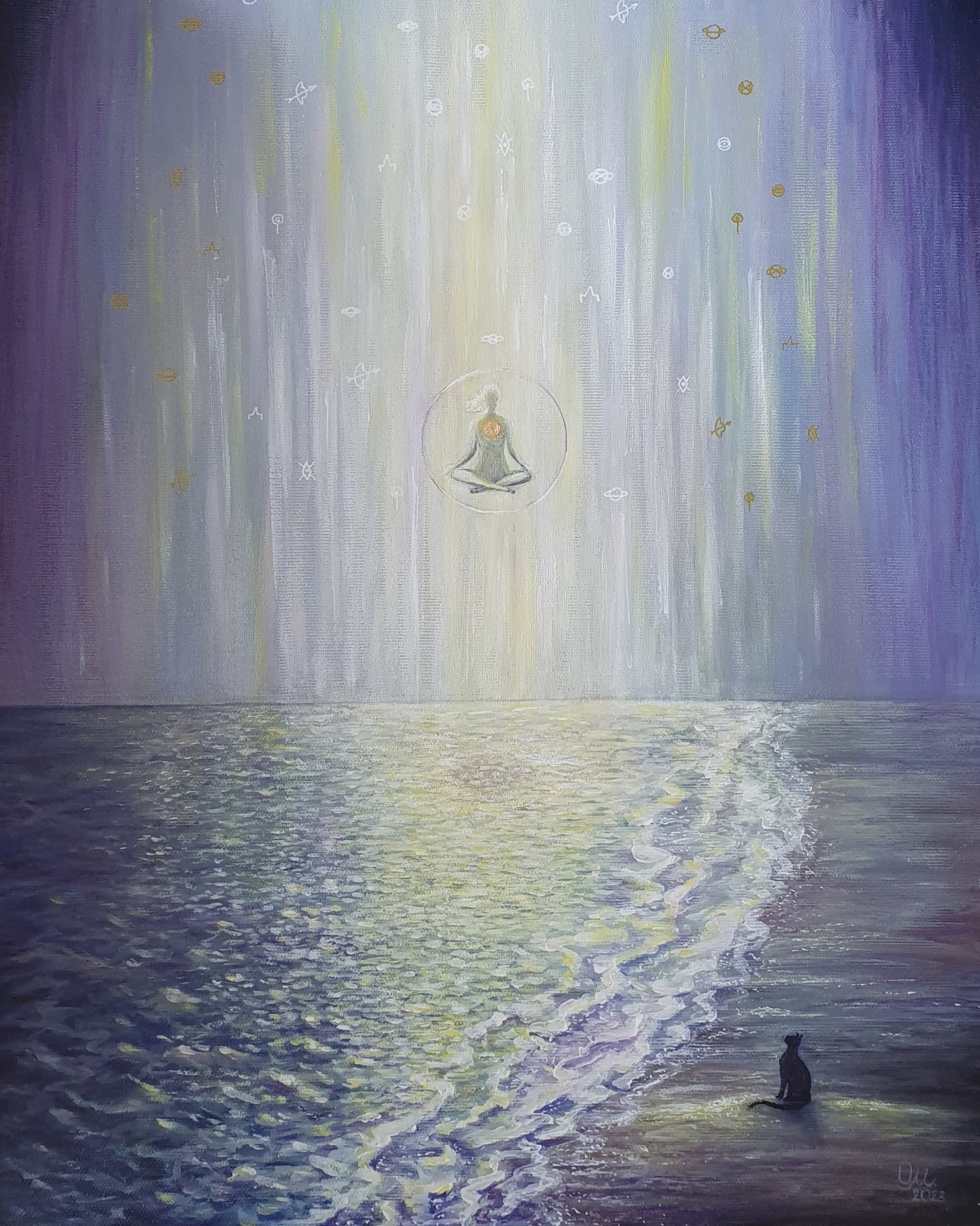 Как-то в очень тёмную ночь, Кошка сидела на берегу и размышляла о своём одиночестве. Было невероятно тихо, но море странно волновалось, а звёзды искрились особенно таинственно. Вдруг краешек неба, что уходил высоко-высоко, в самую глубь Космоса, стал светиться нежным золотым светом, потом к этому золоту присоединились удивительные оттенки серебристого, перламутрово-белого, сиреневого, фиолетового, зеленовато-голубого. Всё это искрящимся потоком спускалось ниже и ниже, разгоняя тьму неба и наполняя округу удивительно уютным загадочным светом. И среди лучей этого света были заметны разные по цвету и форме странные символы. А в самом центре этого потока обозначился какой-то силуэт. Он стремительно приближался, и стало видно, что силуэт находится, как будто, в каком-то шаре, который переливается теми же цветами, что и льющийся с неба поток.