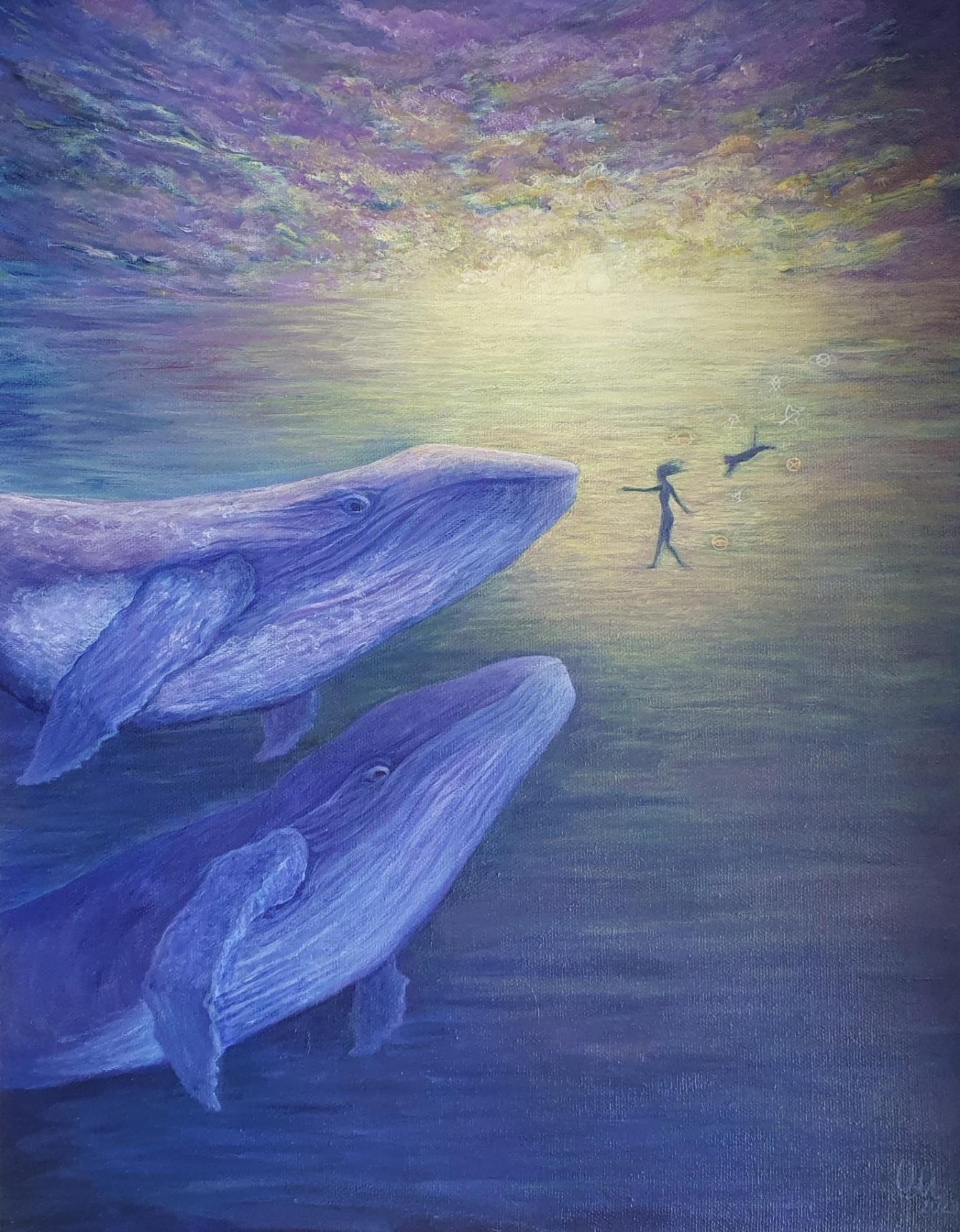 Время летело незаметно, а киты пели и пели, наполняя удивительными звуками всё пространство вокруг. И когда Женщина поняла, что теперь знает всё о воде, о её обитателях, о чудесах и опасностях подводного мира, киты замолчали и подплыли вплотную к своим гостям. Женщина прижалась к киту лицом и поцеловала его в самый кончик морды, поблагодарив за эту потрясающую встречу. Киты ещё раз внимательно посмотрели в глаза своих гостей и, аккуратно подталкивая, помогли им выбраться на поверхность. Затем, издав завораживающий крик, выпрыгнули вверх, показав всё своё великолепие, и ударив хвостом по воде, плавно погрузились вглубь вод и исчезли.