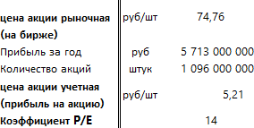 Значение коэффициента “14” означает, что в течение 14 лет компания должна бы зарабатывать прибыль в 5 713 миллиона рублей, чтобы я могла вернуть свои инвестиции. Т. е. через 14 лет прибыль на акцию поднимется с 5.21 до 74.76 рублей за акцию.
