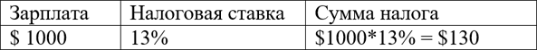 Поэтому с зарплаты в $1000 мы заплатим налог $130