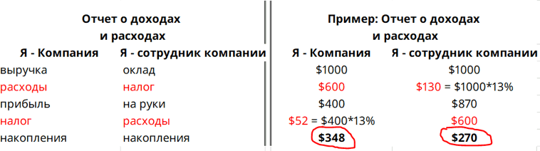 Из таблицы мы видим, что даже имея одинаковый доход и одинаковый расход, накопления Компании будут больше, чем накопления отдельного человека. Потому что по закону, Компании разрешено сначала заплатить долги, а потом, с остатка – налог; мы же сначала платим налог, и только после этого можем идти по магазинам.