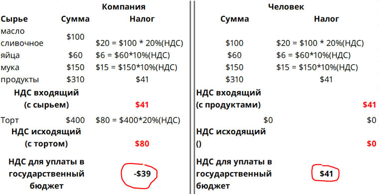 Если я куплю все необходимое и испеку торт а потом его съем, то я ничего не создам для других, никакой добавочной стоимости (ценности), чтобы у меня появился исходящий НДС. Поэтому я плачу в государственный бюджет полную сумму уплаченного мной налога за ингредиенты к торту, а не разницу, как это сделала Компания.