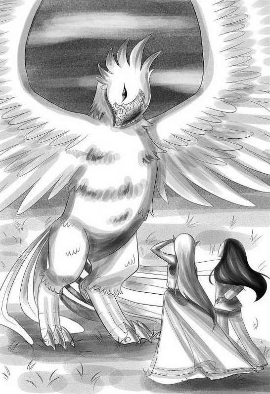 Оказывается те странные существа, что я увидела в последний момент перед пробуждением, были хетлаки. Их послали рикты, чтобы добить единорога. Они напали неожиданно, и Клео пришлось действовать очень быстро. Хоть она и знала, что победит, но в первую очередь отправила меня домой. По счастливой случайности, единорога телепортировало вместе со мной. А то животному было бы не спастись. Хоть эти создания и слабы, но по кровожадности им нет равных. Сражение было недолгим, но кровопролитным. Удивительно, как такая хрупкая девушка смогла отбиться от целой армии! Видимо она обладает великой силой. Оглянувшись вокруг, я не заметила никаких следов чудищ, как, впрочем, и единорога. Очень странно. Надеюсь, он не остался дома, когда за дверью стоит Клэр. Не знаю, что бы она сказала, если бы его увидела. Иногда она пользуется запасным ключом, который я ей дала на случай, если что-то случится. Будем надеяться, что сегодня Клер забыла ключ дома. Мои размышления прервал высокий звонкий крик и мощный порыв ветра в лицо. Я взглянула на Клео. Её глаза были устремлены в небо. Проследив за её взглядом, я увидела нечто невероятное. Это была птица. Да, определённо, птица. Но очень большая. Огромная! И очень красивая. Когда она приземлилась, я смогла разглядеть её получше. У неё был мощный золотой клюв, покрытый узорами. Большие синие глаза сияли, как два алмаза. От головы до хвоста птица была покрыта загнутыми вверх сиреневыми перьями. Каждое перо было размером с мышку от компьютера за исключением самых длинных перьев, в хвосте. Я никогда не видела, какие лапы у драконов. Я вообще не видела драконов. Но мне кажется, что у этой птицы были именно драконьи лапы, но с серебряными когтями. Это существо просто очаровало меня. Птица, видимо, заметила это и расправила крылья во всю длину, позволяя мне оценить их невероятный размах. Клео подошла поближе к птице и шепнула ей что-то. На секунду глаза птицы приняли форму буквы «О». Потом она развернулась ко мне и сделала то, чего я меньше всего ожидала – поклонилась мне… Я была ошарашена. Но то, что я увидела, а вернее – услышала потом, потрясло меня ещё больше. Птица подняла голову и обратилась ко мне. Да. Именно обратилась, по-настоящему, на обыкновенном человеческом наречии. Только, в отличие от Клео, она говорила со странным, неизвестным мне акцентом. Тем не менее, речь её была на удивление хороша.