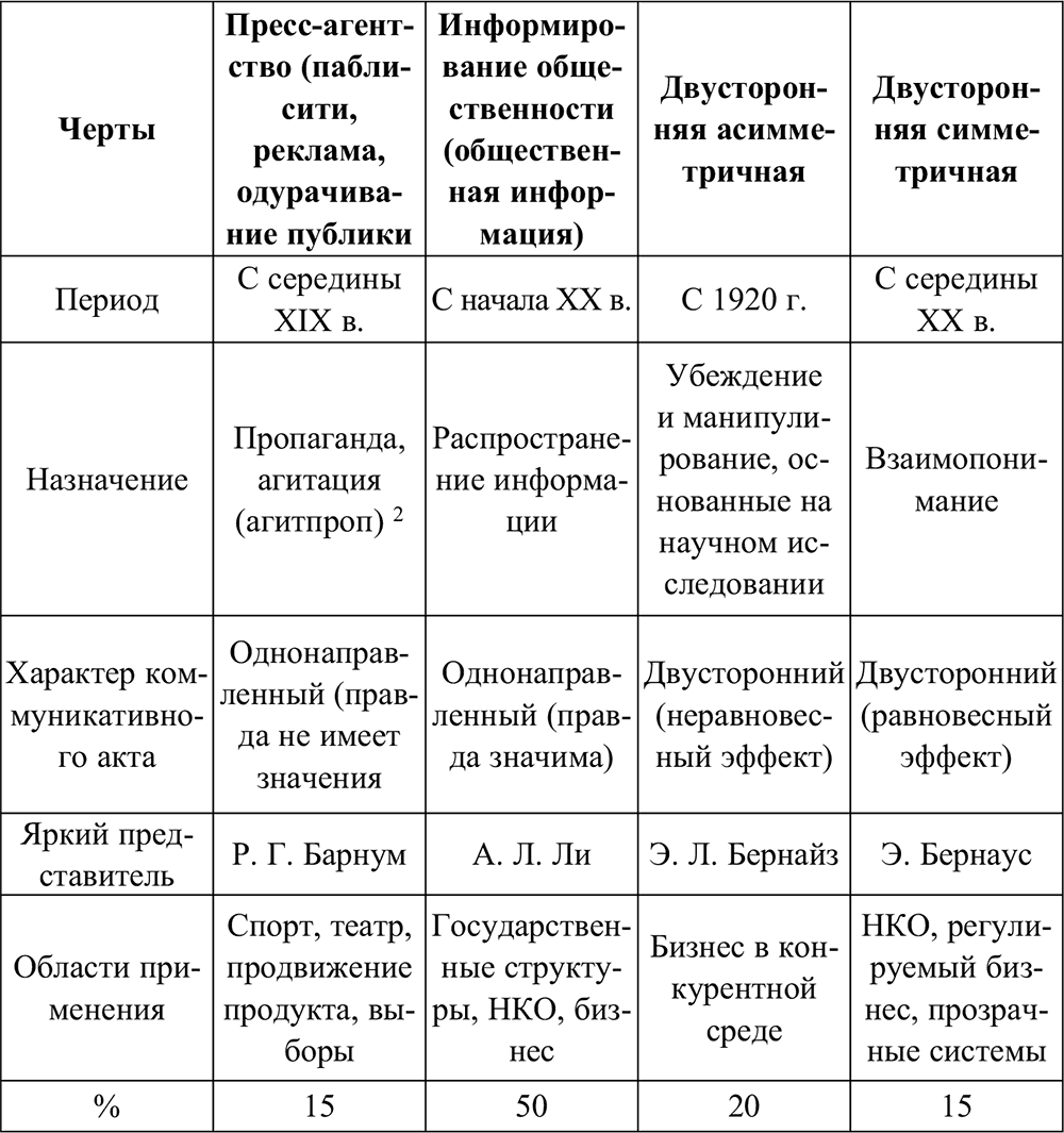 Развитие технологий и средств PR, их особенности тесно взаимосвязаны с развитием самого института связей с общественностью. Практически все исследователи института паблик рилейшнз выделяют четыре исторические модели PR[10] (табл. 1).