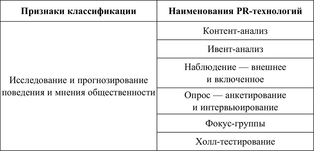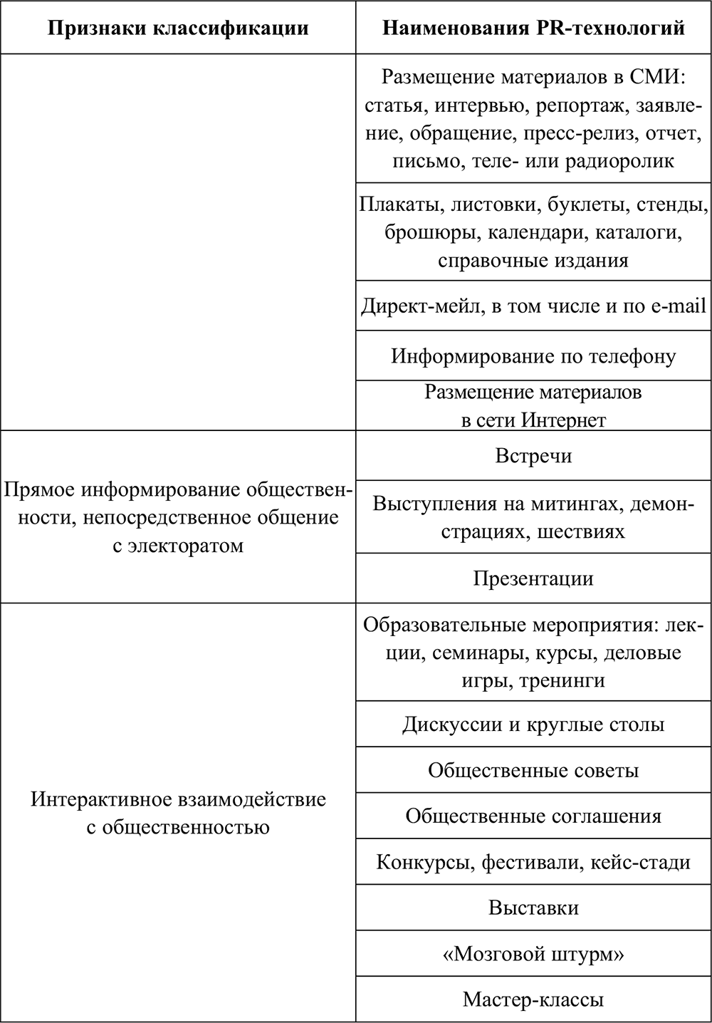 Часто используемая в практике классификация PR-технологий представлена в виде таблицы 3.