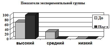 Высокий уровень развития в экспериментальной группе выявлен у 65%, в контрольной группе у 40%.