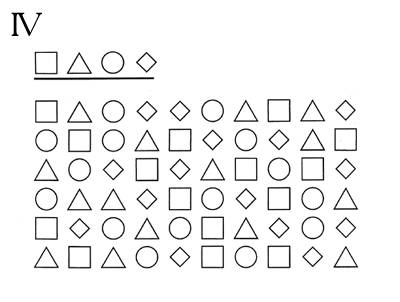 На доске рисуются четыре пустые фигуры (квадрат, треугольник, круг, ромб), которые в процессе подачи инструкции специалист заполняет соответствующими знаками, такими же, как в образце задания (первая строчка из четырех фигур, которая подчеркнута).