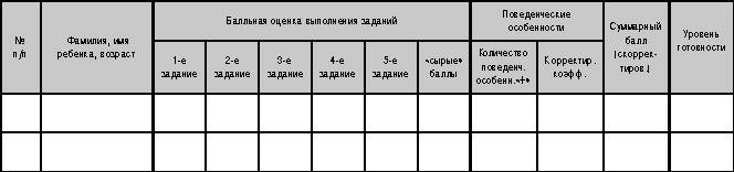 Итоговые результаты обследования каждого ребенка и группы детей в целом удобно свести в общую таблицу (см. образец бланка).В графе «Фамилия, имя ребенка, возраст» удобно фиксировать возраст ребенка в полных годах и месяцах (на момент обследования), а не приводить дату рождения. Это облегчает анализ результатов.