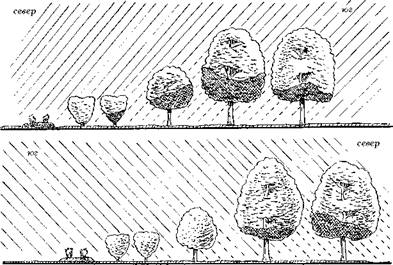 На каждое растение действует четыре типа освещения: верхний, передний, задний и нижний свет (рис. 1). На рисунке дана схема двух одинаковых деревьев, высаженных с южной и с северной сторон дома.