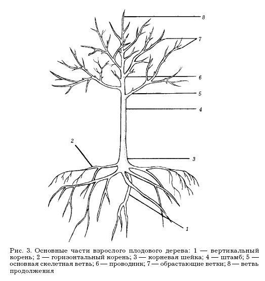 У плодовых и ягодных растений выделяют надземную и корневую системы. К надземной части относятся ствол, представляющий собой вертикально растущий стебель и несущий на себе крону; затем штамб, включающий в себя часть ствола от корневой шейки до нижней скелетной ветви.