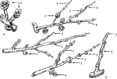 Рис. 5. Обрастающие веточки косточковых культур: а – вишня: 1 – букетные веточки; 2 – проросшая букетная веточка; 3 – генеративные почки на однолетней ветке; 4 – вегетативные почки; б – слива: 1 – обрастающие веточки типа букетных; 2 – вегетативные почки; 3 – групповые почки; 4 – шпорцы; в – персик: 1 – генеративная ветка; 2 – групповые почки; 3 – смешанная ветка; 4 – букетные веточки