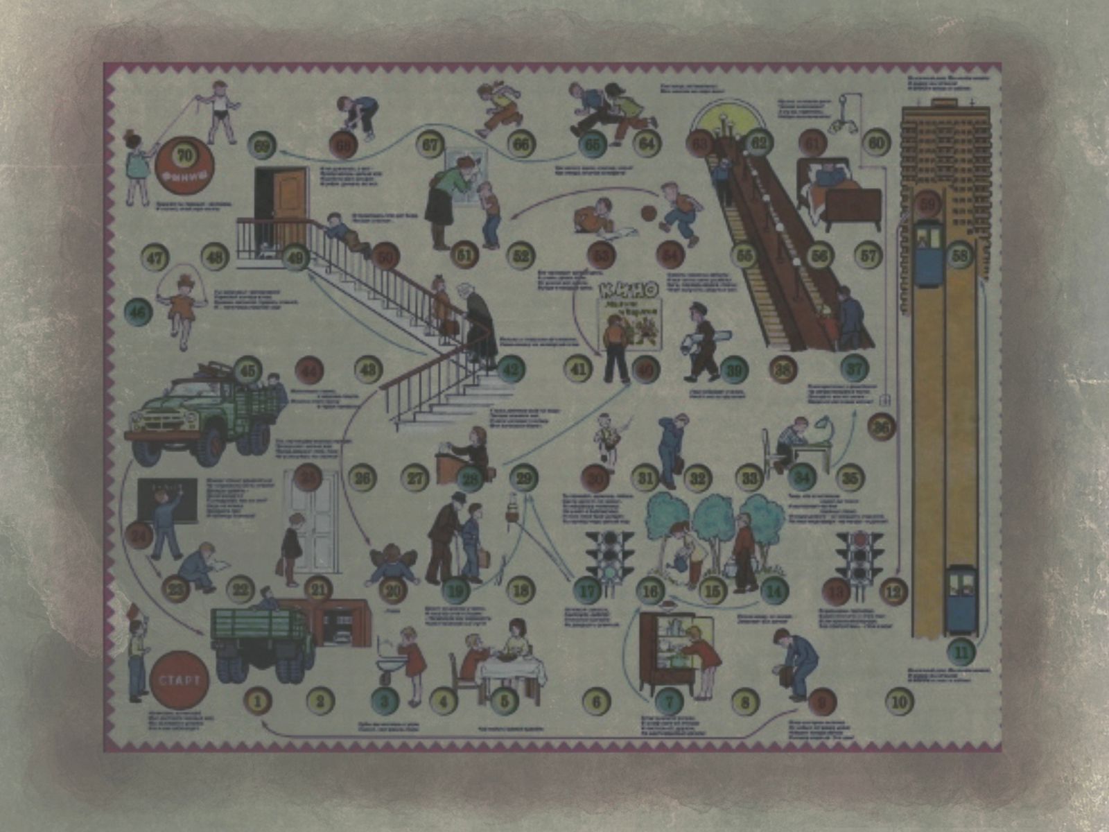 Законы Вселенной действуют во всех сферах нашей жизни: от строения и жизнедеятельности молекулы, до устройства Солнечной системы. Думаю, поколение, жившее в СССР, помнит детскую настольную игру с фишками и кубиками. Вариантов этой игры много, я приведу пример авторов Кончаловская Н., Зелёная Р., Трубкович В. 1956, настольная игра "С утра до вечера".