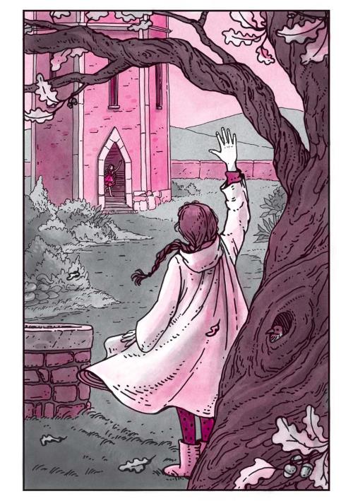 Во дворе были видны следы каких-то разрушительных работ. Соседний дом зиял пустыми окнами. Зажмурившись, Тюха зажала в руке жёлудь – и вдруг оказалась почти у самого ствола Главного Дуба. Тюха растерянно оглядела поляну, колодец, сад, опушку леса, башню, сиявшую медовыми стенами. Таким безмолвным и пустым она ещё никогда Зачарованный Сад не видела. Её всегда кто-то встречал, и теперь Тюха недоумевала, что делать дальше. Но тут дверь башни распахнулась, и на порог выскочила девочка в ярко-красном платье.
