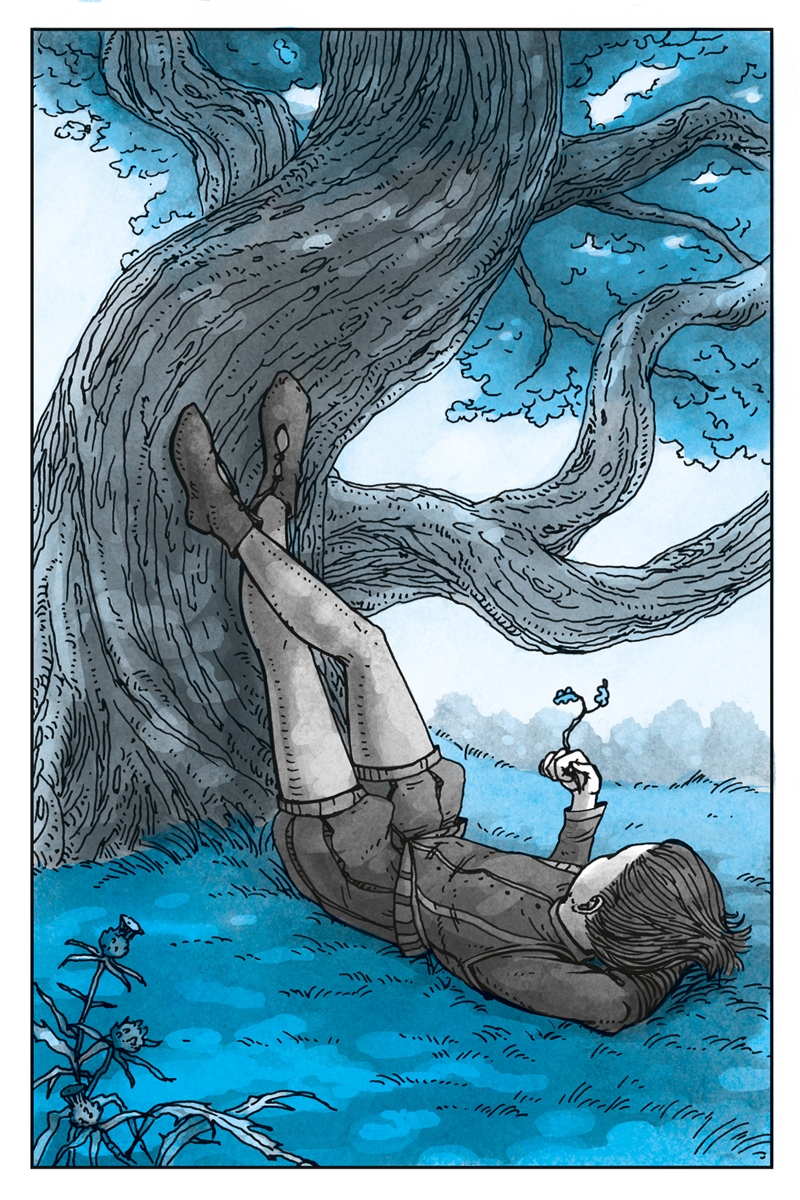 Тем временем они подошли к Дубу. Листья на нём ещё не развернулись полностью, а только чуть проклюнулись из почек. От этого под Дубом на траву легла узорная, как кружево, тень. В тени, закинув руки за голову, растянулся Том. Глаза его были закрыты, и он не подумал их открыть.