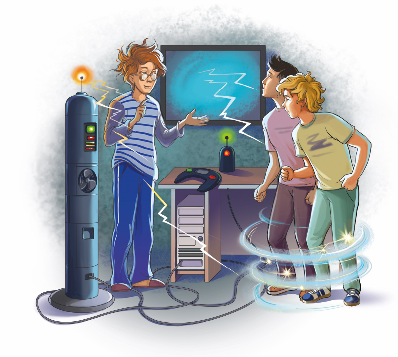 – Хорошо! Очень хорошо! – обрадовался Николай и энергично потёр ладони. – Начинаем! – Он нажал кнопку на «обогревателе», прибор загудел, а полы и стены завибрировали. Мальчики стояли как вкопанные, не в силах сдвинуться с места. Тем временем из экрана потянулись два луча: от Юриного персонажа к Юре, от Жениного – к Жене. Дотянувшись до ребят, лучи обволокли их в световой кокон. Снизу послышались приглушённые крики соседей, в пол застучали. Вдруг всё стихло – и гудение, и вибрация. Только соседка снизу всё продолжала кричать.