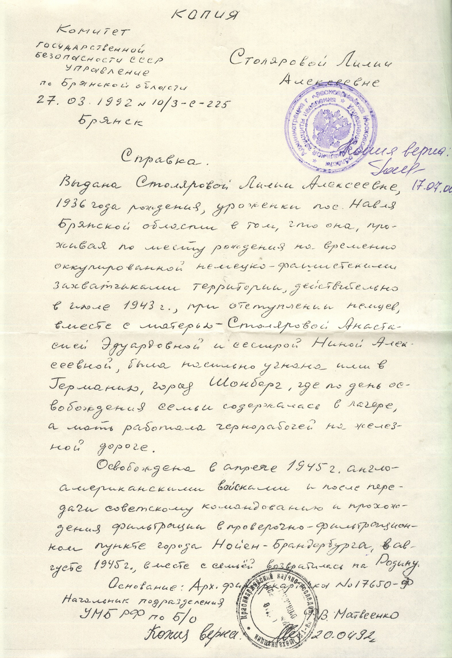 Я, Князева Людмила Филипповна, (девичья фамилия Алексеенкова) родилась в крестьянской семье 1 сентября 1940 г. в Екимовическом районе Смоленской области, в деревне Усохи. После войны нас перевели в Калужскую область и поэтому по всем документам мое рождение зарегистрировано в Калужской области.