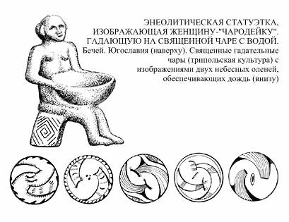 В трипольской культуре (поселение в Незвиско) известны статуэтка сидящей женщины, седалище, расписная чара и «черпало»; всё это – принадлежности ритуала заклинания воды, моления о дожде, глиняные модели настоящего обряда. Известно большое количество мисок-чар трипольской культуры с различными изображениями на внутренней, предназначенной для воды поверхности. Обращают на себя внимание чары со стилизованными фигурами двух оленей. У оленей изображены ветвистые рога, передние ноги, а их туловища обозначены широкой полосой, как обычно трипольские художники изображали дождевые полосы. Эти дождевые олени как бы мчатся по небосводу в каком-то вихре; под их ногами иногда изображена земля, но сами они летят над землей, не соприкасаются с ней. Иногда в центре чары изображен знак женского пола (Старая Буда) (см. рис. 18).
