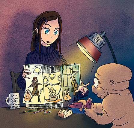 Мы нашли очень хороший способ, помогающий понимать друг друга – рисование. Я не бог весть какой художник, но карикатуры в школьные годы получались удачные. Вот в таком жанре я и рисовала разные ситуации, вещи и действия. Он долго рассматривал авторучку, потом крепко ухватил ее пальцами и тоже начал рисовать. Каждая картинка сопровождалась с обеих сторон многословными комментариями. Как он все запоминал! Он пытался говорить со мной, и я понимала его корявую речь, как мать, наверное, понимает лепет своего ребенка. Лепет, который окружающим кажется просто бессмысленным набором звуков. И я не уставала удивляться какой Херши догадливый! Хотя, наверное ничего удивительного, пусть он внешне и не образец привлекательности, но чтобы летать по космосу нужно, наверное, быть как минимум образованным.