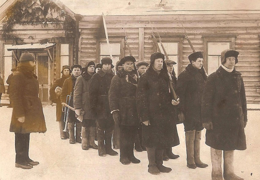 Учения Ворошиловских стрелков. 4 винтовки Мосина 1898 г, 1 топор. Второй справа – Василий Галанов. Село Старожилово, 1937 г.
