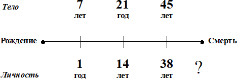 Наше тело и наша личность, а именно ее высшая часть (ядро личности), развиваются несинхронно. Первые проявления ядра личности можно наблюдать примерно в районе 7 лет. Ребенок в этом возрасте начинает смутно осознавать себя как полноценную, самостоятельную единицу. Развитие личности во многом зависит от того окружения, в котором живет человек, от условий, в которых он развивается. При идеальных условиях жизни задержка развития личности составляет примерно 7 лет от возраста его физического тела. Но идеальных условий нет, и мы часто наблюдаем великовозрастных детей или, наоборот, не по годам здравомыслящего человека.