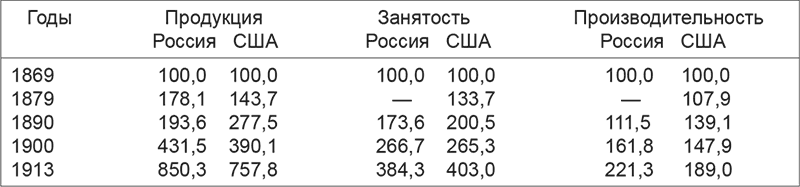 Динамика объема промышленной продукции, занятости и производительности труда в промышленности России и США[14] (1869 = 100 %)
