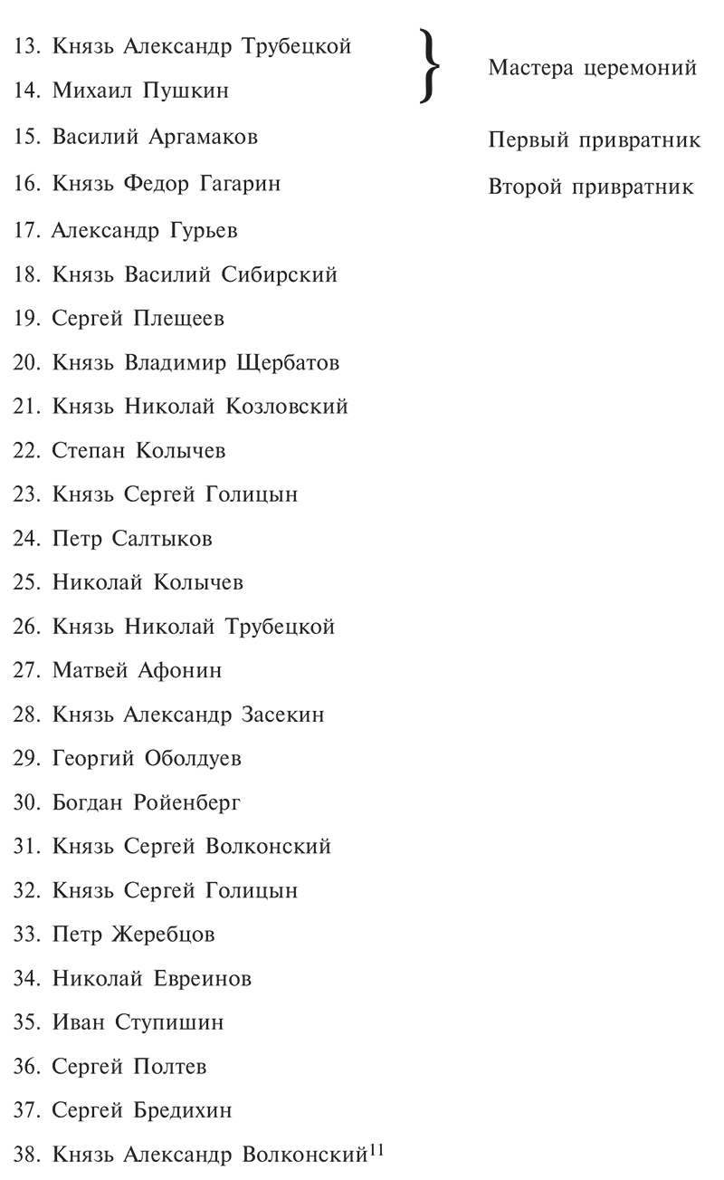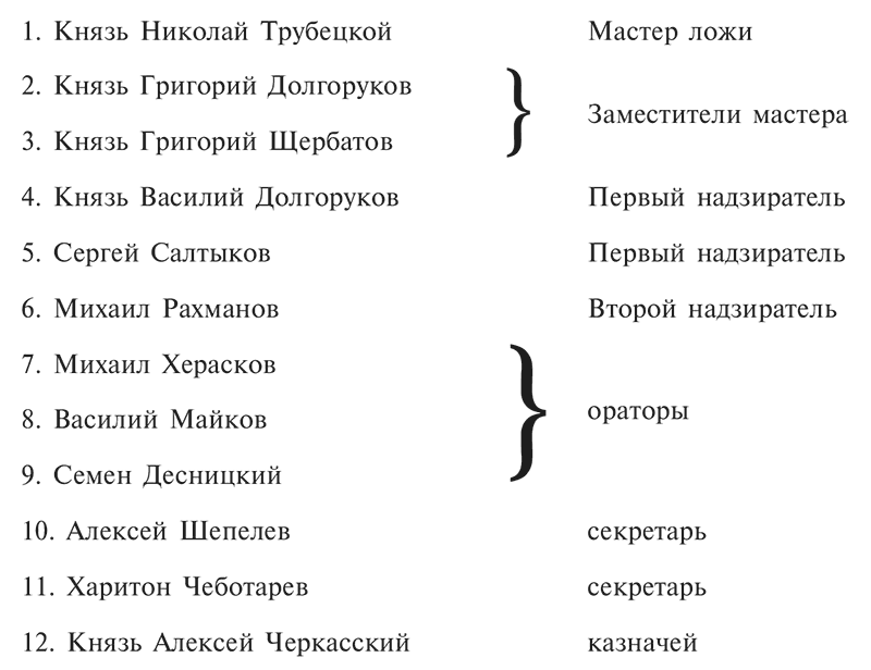 Члены Капитула Восток Санкт-Петербурга [1777]:князь [А. Б.][30] Куракин – Приор князь [Г. П.] Гагарин – Великий Префект граф [А. С.] Строганов граф [Я. А.] Брюс граф Петр Разумовский князь Несвицкий князь Георгий Долгоруков барон Строганов президент[31]