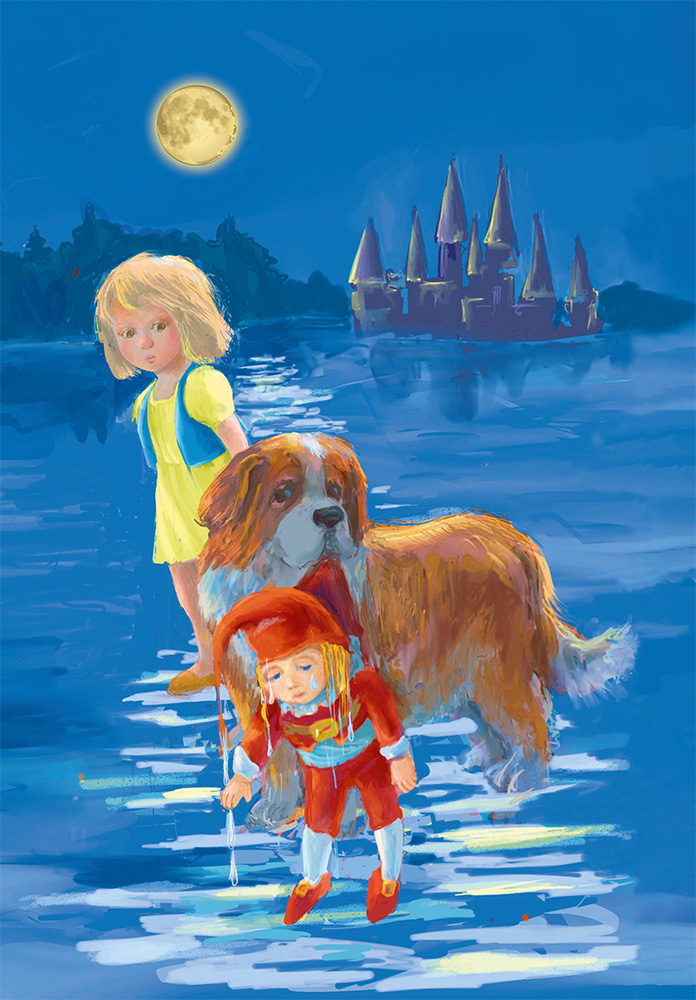 Лена очень смеялась, глядя на эту сцену, но затем спохватилась и попросила Плаксу залезть на спину Астора. На сей раз домового не пришлось уговаривать, и тот, кряхтя, вскарабкался на спину пса. Лена почувствовала себя увереннее. Теперь рядом с ней был её верный друг Астор. Но узкую серебряную полоску лунной дорожки отделяла от берега таинственная и чёрная гладь воды. Стало страшно, но Лена знала, что сейчас только от неё зависит, придёт ли помощь маленькой девочке, попавшей в беду.