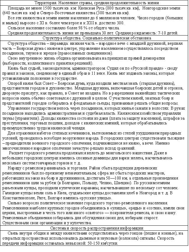 В период феодальной раздробленности Русь, оставаясь крупной европейской страной, не имела единой государственной власти, которая вела бы общую для всей страны внешнюю политику. В середине XII в. русские князья вступали в союзные отношения с государствами, которые входили во взаимно враждебные коалиции. Ослаблению внешнеполитического положения Руси, сокращению её территории способствовали феодальные распри князей, которые не прекращались даже тогда, когда в страну вторгались враги. Кочевники-половцы, заняв Северное Причерноморье, совершали опустошительные набеги на южные русские земли, уводили в плен и продавали в рабство русское население. Они подрывали торговые и политические связи Руси с Причерноморьем и странами Востока. Это привело к утрате Русью её владений на Северном Кавказе, а также к потере Таманского полуострова и части Крыма, захваченных Византией. На западе венгерские феодалы захватили Карпатскую Русь. В Прибалтике земли латышей и эстонцев попали под удар немецких и датских феодалов, а земли финнов и карел – под удар шведских. В XIII в. монгольское нашествие завершило разорение и расчленение самой Руси на отдельные княжества. Данные за период 10-13 веков приведены в следующей таблице.