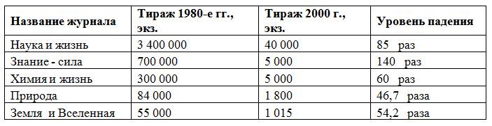 Судить о тогдашнем состоянии известных журналов можно по данным из статьи А.Г.Ваганова «Научно-популярная журналистика и престиж науки в общественном сознании», Российский Химический Журнал (ЖРХО им. Д.И.Менделеева), 2007 г.