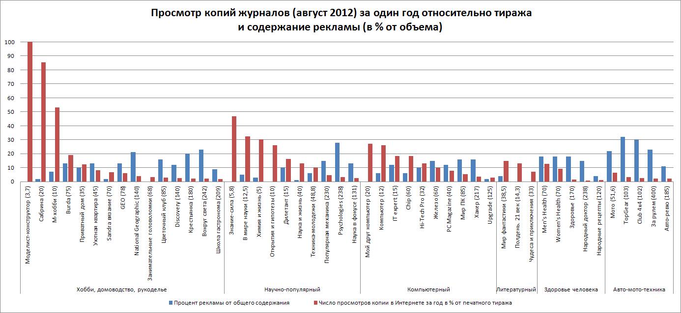 Данные представляют собой сводку по наиболее популярным журналам, изданным в августе 2012 года и копии которых были просмотрены пользователями Интернета в течение календарного года.