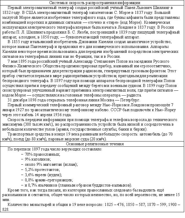 Русские умельцы и изобретатели продолжали свои труды на благо Отчизны: крепостные Ефим и Мирон Черепановы построили первый паровоз и железную дорогу в России; Иван Кулибин построил водоход – речное судно, в котором тягловую силу бурлаков заменяла сила течения воды; Федор Пироцкий – изобрел трамвай на электрической тяге; Федор Блинов сконструировал первый гусеничный трактор; Андрей Власенко создал зерноуборочный комбайн, превосходивший все зарубежные образцы… Вот только труды их остались невостребованными – чиновники и промышленники не верили в своих гениев, предпочитали платить золотом за иностранную продукцию (воистину, нет пророка в своем Отечестве!). Краткая информация по периоду представлена в следующей таблице.