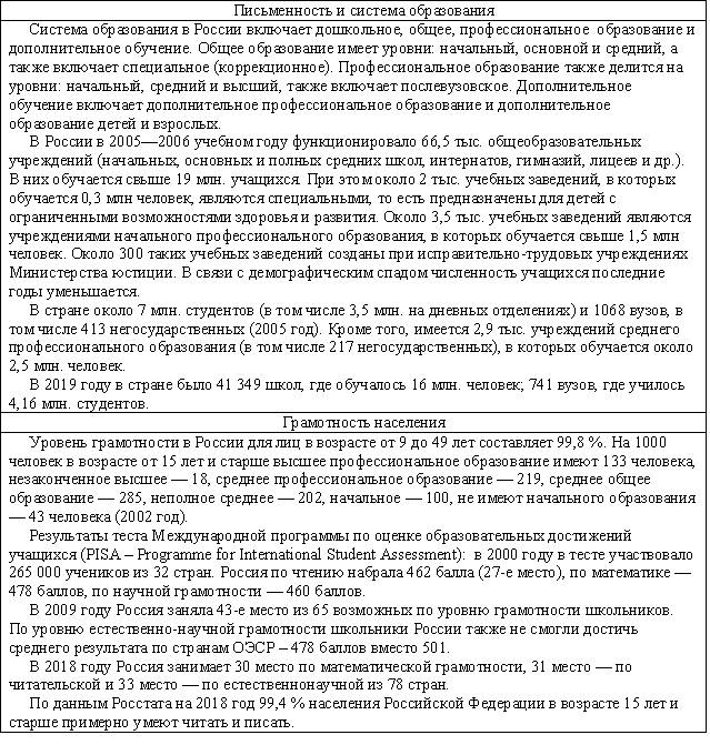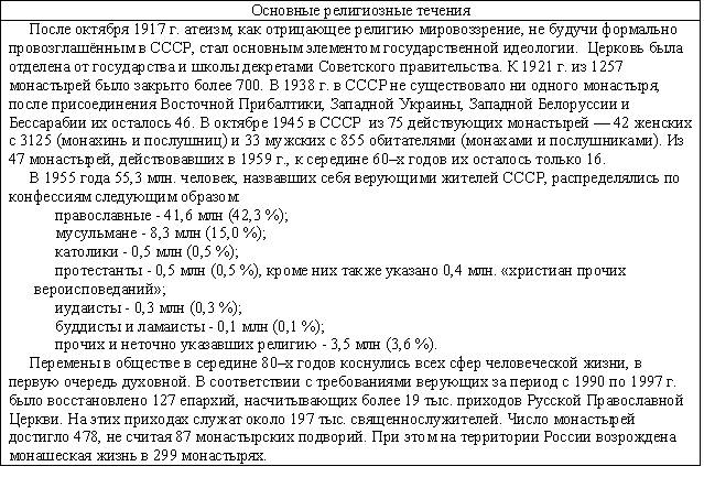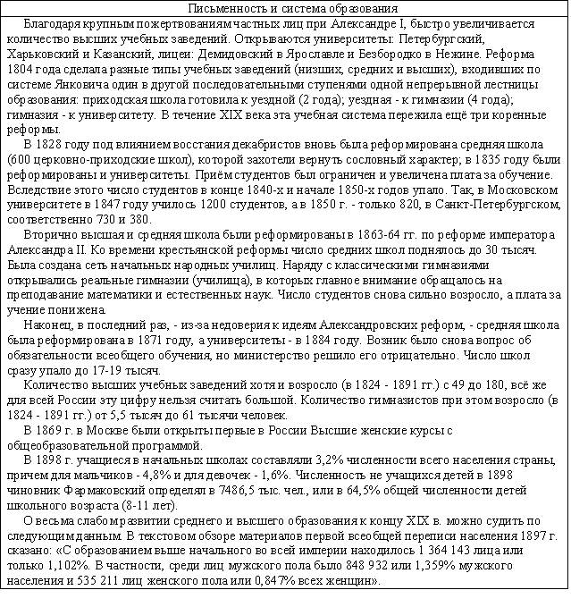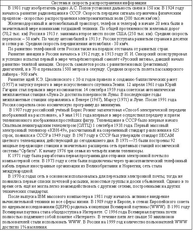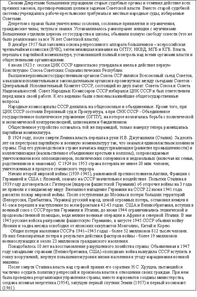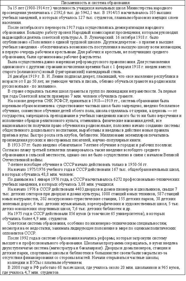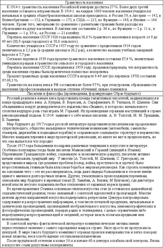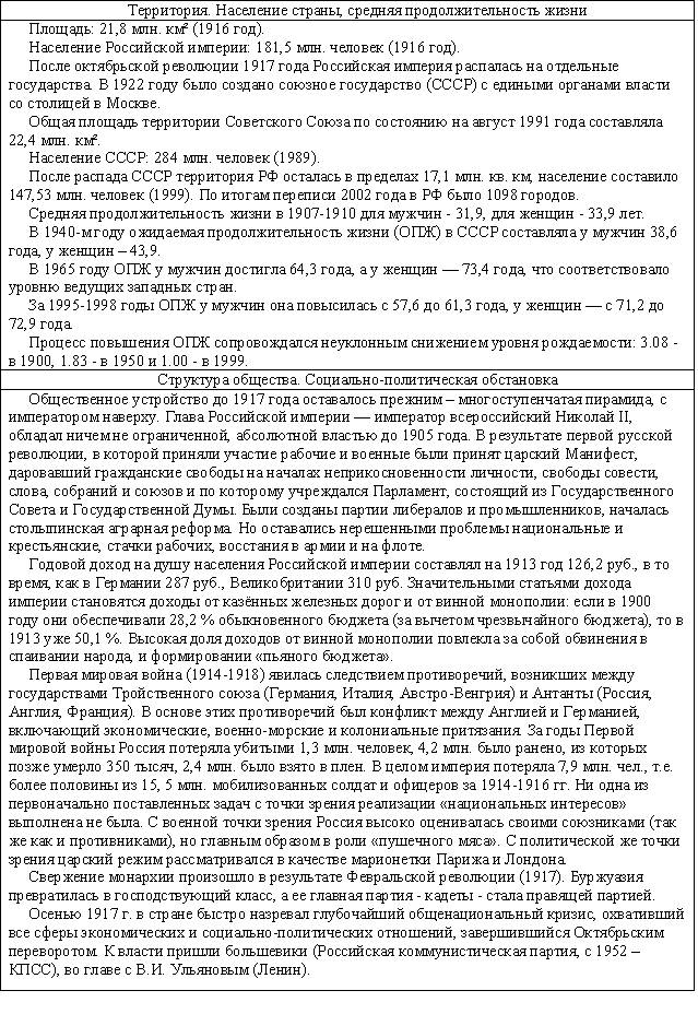 В этом веке продолжаются войны между государствами, которые показывают неизменность политики власть имущих: неважно, чего хочет народ, главное – удовлетворение своих амбиций и уверенности в том, что группка не самых умных и культурных людей может решать судьбу страны. Позорно проигранная война с Японией (1905) доказала техническую отсталость России, вызвала восстания рабочих и привело к разработке крестьянской реформы. Первая Мировая война (1914-1918) привела не только к поражению страны, которую использовали союзники в качестве «мальчика для битья», но и к свержению монархии как государственного строя и последующей Гражданской войне (1917-1923), которая разделила мир на две противоборствующие стороны по идеологическому принципу (капитализм-социализм). Переток крестьян в города и превращение их в наемную рабочую силу усилился настолько, что к середине века городское население превысило сельское в 4-5 раз. Этому способствовало и то, что при советской власти крестьяне оставались бесправными рабами системы, насильно загнанных в колхозы и совхозы, не имели возможности свободно менять место жительства, получали мизерную оплату и зачастую были лишены медицинской помощи. Индустриализация 30-х годов, Вторая Мировая война 40-х , послевоенное восстановление страны и дальнейшее её развитие повысили уровень образованности населения, люди стремились к знаниям и культуре, а это порождало ненужные для правящей партии (коммунистов) вопросы и требования интеллигентов (о несоответствии уровня жизни большинства с правящим меньшинством, о несравнимости с уровнем жизни загнивающих капиталистов и т.п.), которые привычно давились репрессивной машиной (КГБ, армия). Число образованных людей росло, но при этом росла и специализация, когда человеку не давали общего образования, расширяющего кругозор, а обучали работе в отдельной области знаний или занятий. Это приводило к расслоению образованных людей (физики и лирики, гуманитарии и технари) на разобщенные по профессиональному признаку группы, что было на руку власть имущим – контролировать и управлять небольшими группами проще, чем большим сообществом. Эта разобщенность образованных людей, поддерживаемая власть имущими, и не дала возможности создать после распада СССР по-настоящему демократического государства, которое управлялось народом и существовало для обеспечения его развития и процветания. Краткие сведения по самому пртиворечивому и насыщенному событиями веку представлены в следующей таблице.