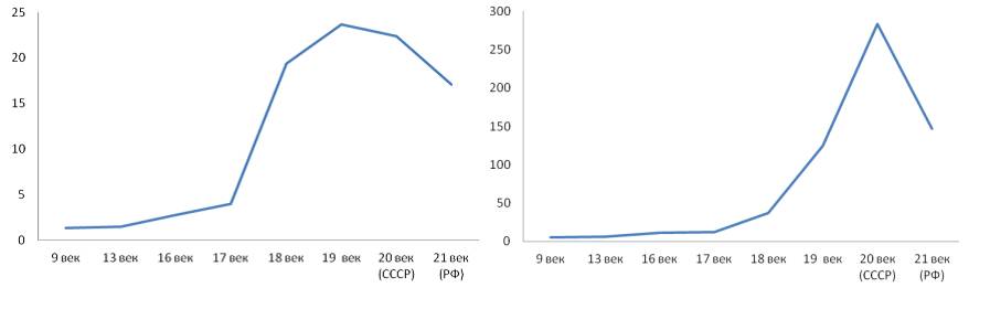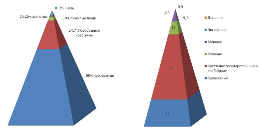 Рисунок 5. Изменение структуры общества в %-ном отношении (слева – в 17 веке, справа – в 19 веке)