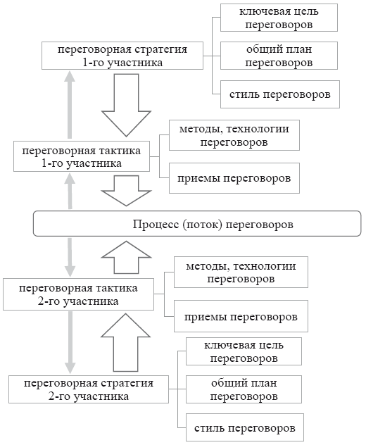 Основная идея, которую мы хотим донести через схему: определяющими элементами переговорного процесса являются стратегия и тактика, что подчеркивает важность планирования процесса, его предварительного осмысления и подготовки. Вместе с тем, не может быть незыблемых идей и недвижимых ориентиров. Сам ход процесса может вносить коррективы, требующие импровизации и быстрой смены установок.