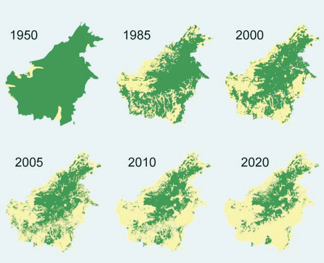 В глобальной сфере в настоящее время игнорирование бизнесом своей ответственности чаще всего рассматривается с позиции экологии. Тревожность за последствия деятельности бизнес-структур имеет под собой почву. Так, на острове Борнео в период с 1985 по 2001 г. лесозаготовителями по заказу одной из корпораций было уничтожено около 60 % тропического леса ради добычи пальмового масла. Карту исчезновения «легких» на этом участке суши с прогнозом на будущее можно увидеть на изображении Deforestation in Borneo 1950–2020 (рис. 1.5) [97].
